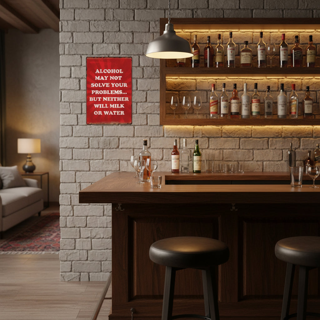 - Vintage Design: Our tinarts feature a classic design that brings humor to your bar. The "Alcohol may not Solve your Problems but Neither will Milk or Water" tinarts sign has a rustic finish with an antique feel, perfect for adding a touch of nostalgia to any room.